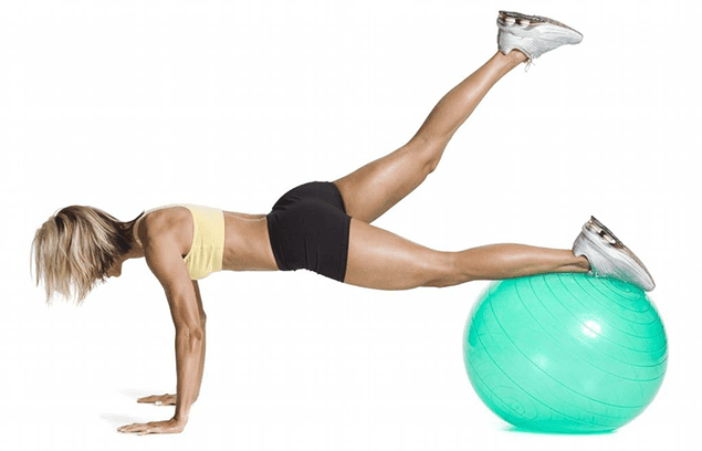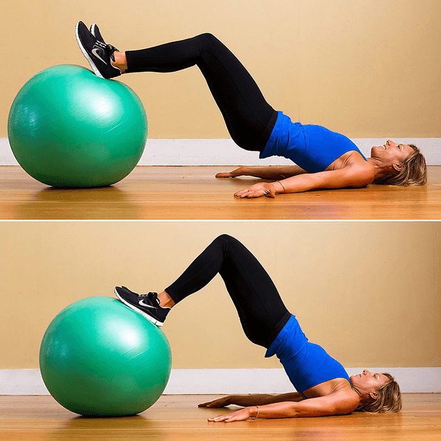 Haz rodar la pelota lentamente hacia ti, apoyando los pies sobre la mísma a la vez que elevas la cadera. Mantén la posición unos segundos y vuelve a la posición de inicio. Repite de 15 a 25 veces.