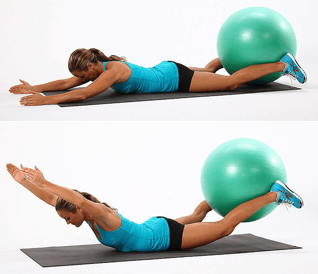 Túmbate boca abajo, brazos estirados hacia adelante y pelota entre ambos pies. Toma aire, aprieta la pelota y levanta piernas, brazos y pecho del suelo. Mantén la posición durante 5 segundos y vuelve a la posición inicial otros 5 segundos. Realiza 2 series completas de 10 repeticiones.