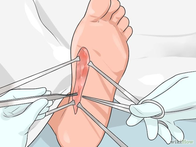 Fasciotomía plantar del empeine: los médicos quitan parte de la fascia plantar para aliviar la presión en el nervio del pie.